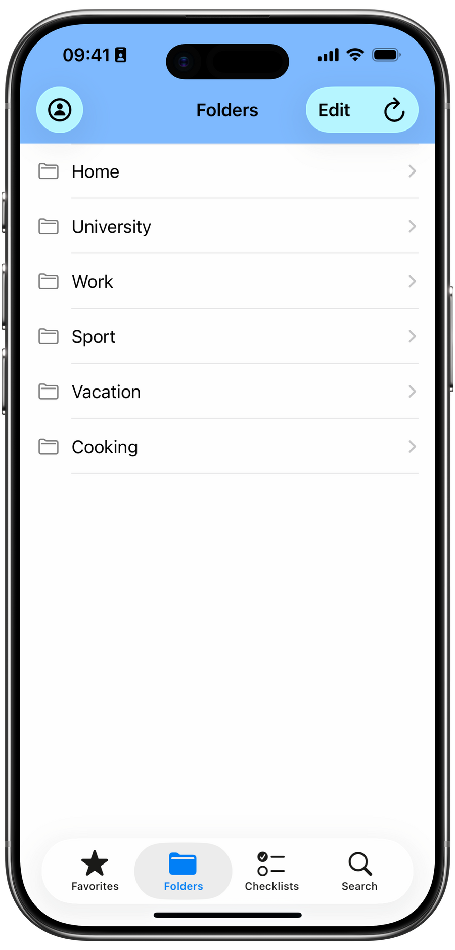 • Folders: Organize related checklists by theme (e.g., Work, Home, Travel).