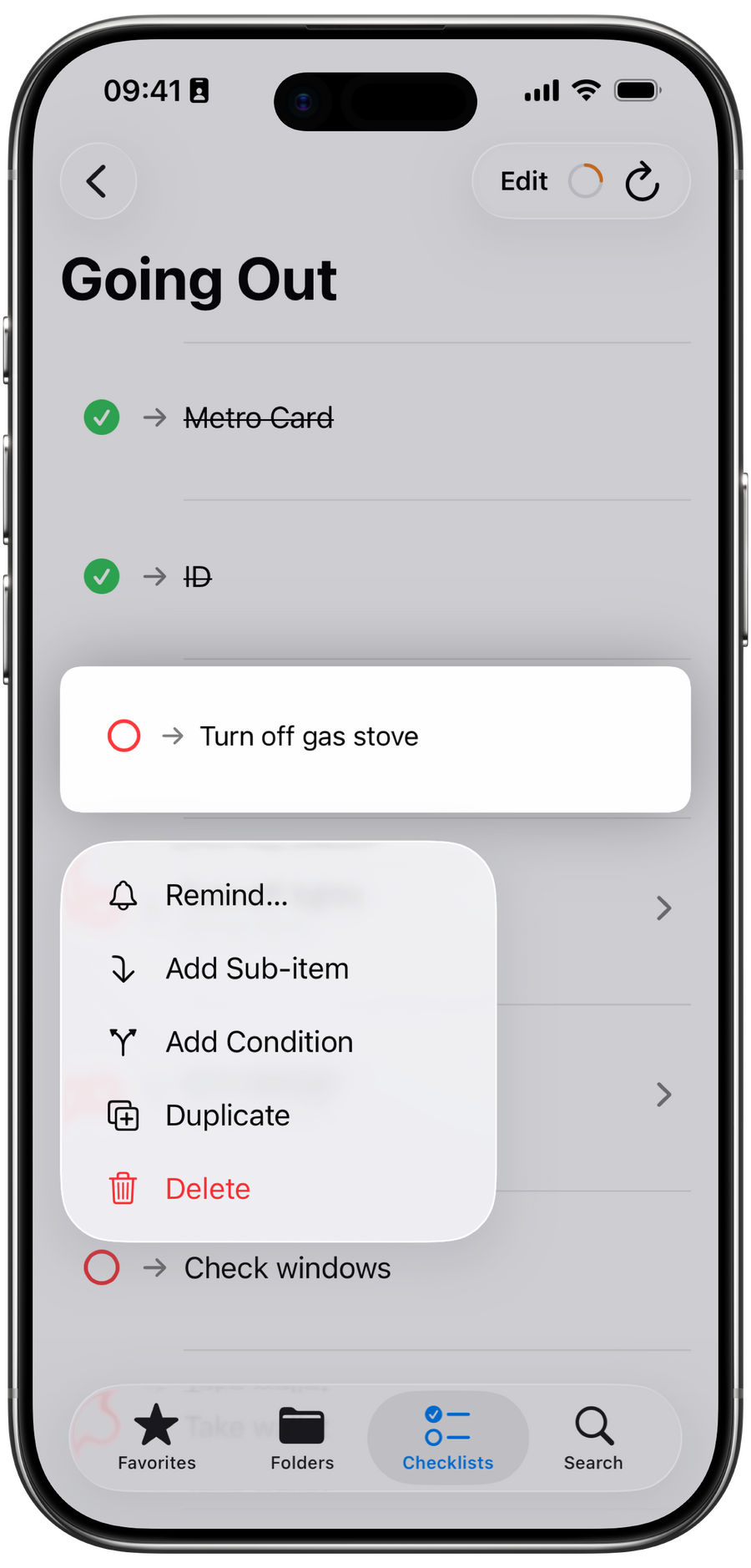 • Long-press an item or checklist to duplicate it for quick variations.