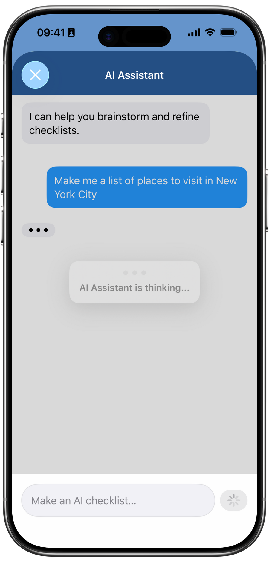 Let the AI Assistant help you brainstorm and create checklists faster.• Open the AI Assistant from the Checklists or Search context (look for the sparkle/wand icon).