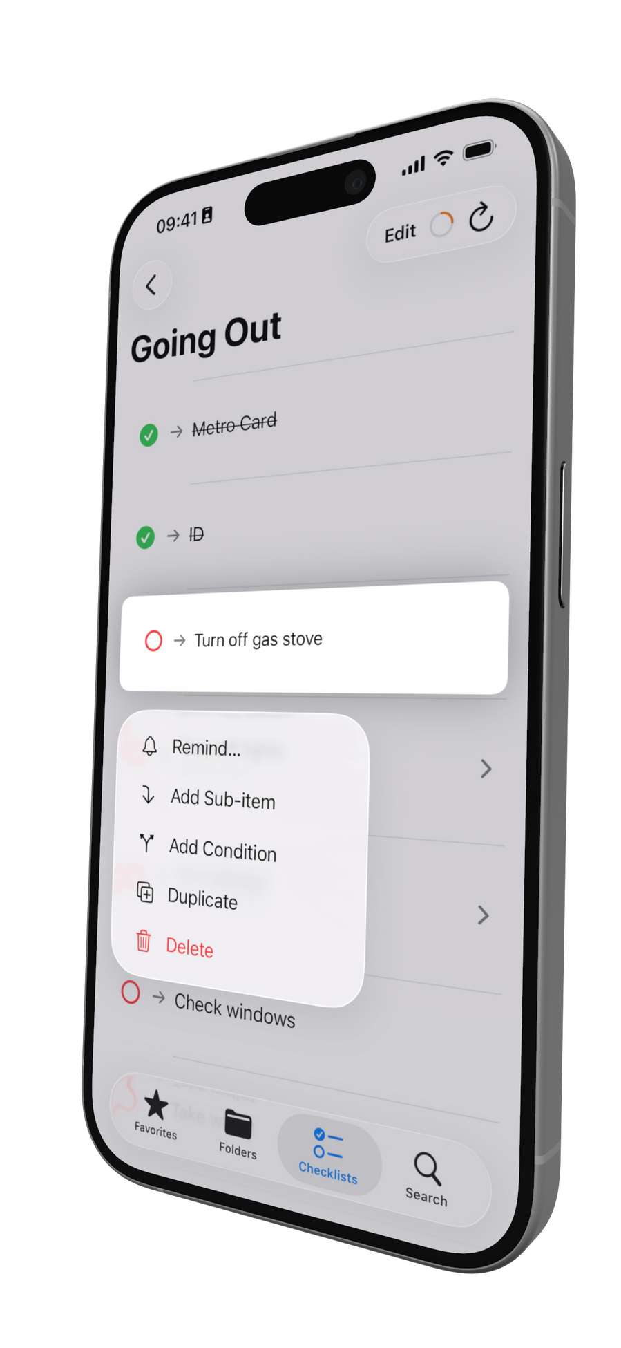 • Long-press an item or checklist to duplicate it for quick variations.