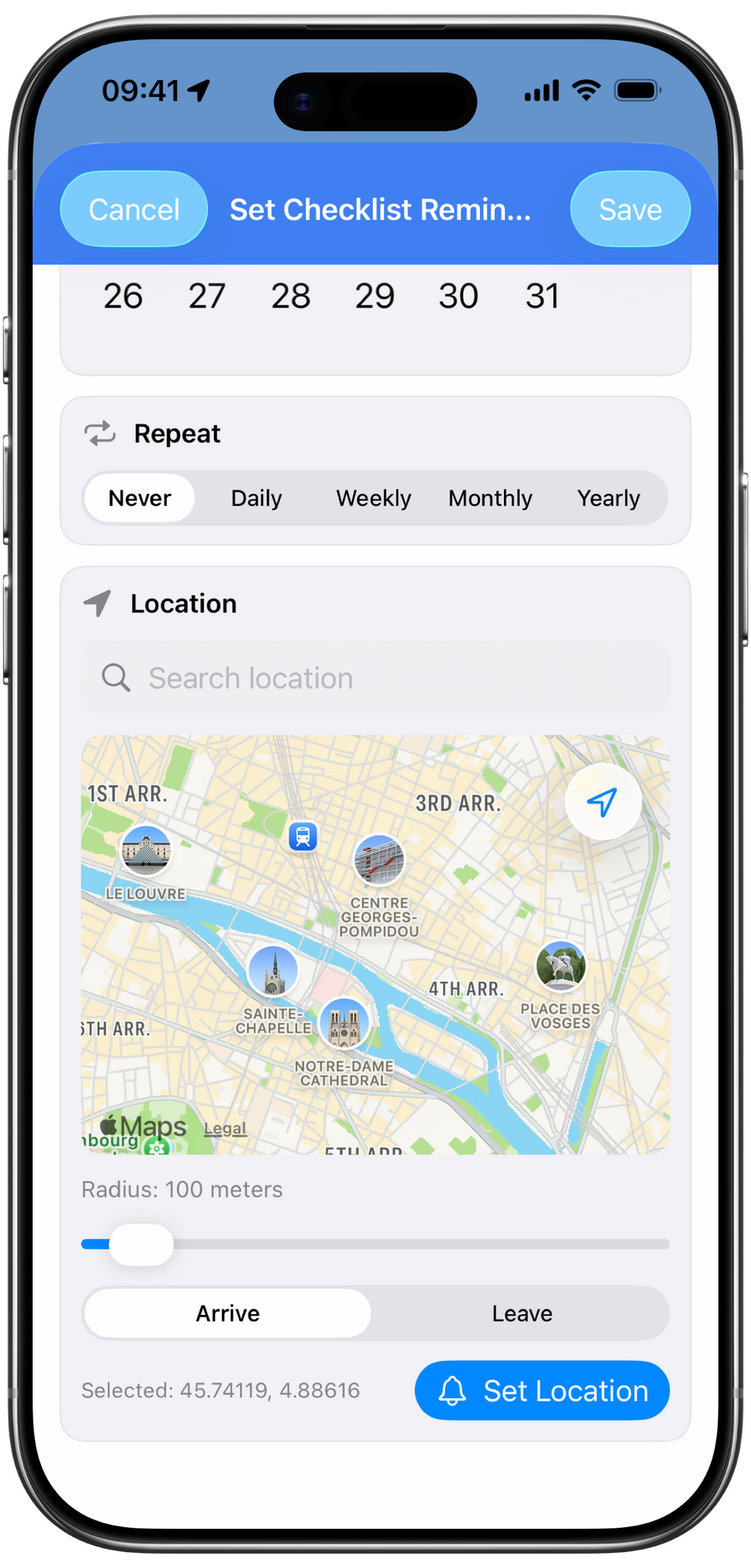 • Location-based reminders: Get notified when arriving at or leaving a specific place. Adjust the radius to fine-tune sensitivity.How to set a reminder: