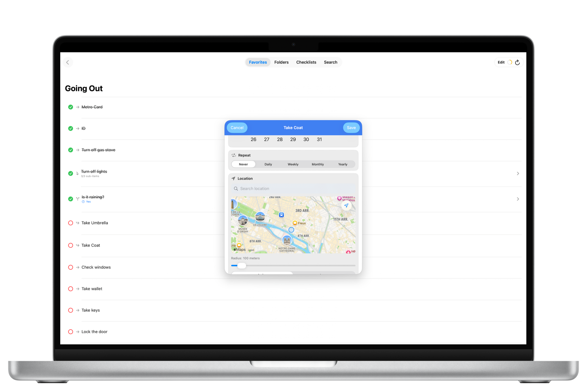 • Folders: Organize related checklists by theme (e.g., Work, Home, Travel).