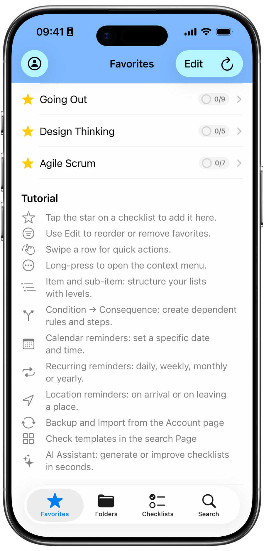 • Tip: Use Favorites for your most frequent routines (e.g., “Going Out,” “Daily Standup”).• Search: Find reminders, templates, and manage global reminder settings.• Edit mode: Tap Edit in the top-right of many screens to reorder, bulk-select, or perform batch actions.