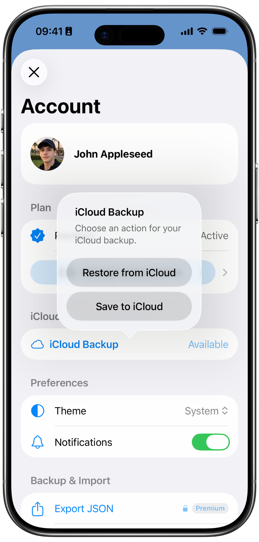 • Access the Account screen to manage your plan, theme, notifications, and iCloud backup.